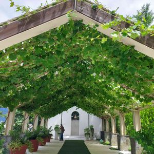 ちょっと見てください! この素晴らしいブドウ棚を! ぶどうの実は観賞用なんですって!!! ちなみに10本植えてありました。