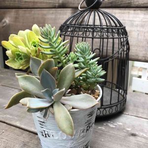 一目惚れして買ったリメ缶♡ パステル紫が良い感じ♡♡ 熊童子の斑入りと、 子猫の爪を一緒に寄せ植えしたら、 猫ちゃんがリメ缶に飛び乗ってきてカメラ目線!🐱 そこを写真📷撮りました👍✨