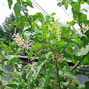 ヨウシュヤマゴボウが 2m程の高さに繁って沢山の実をつけていました😁 間もなく紫色の房になるでしょう❗ 美味しそうだけど 有毒です😱 誤食すると嘔吐、下痢、けいれんなどの中毒症状が起きますよ‼️