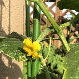 きゅうりもグングン成長し、植え付けの倍くらいの約45センチ程になりました♪ しっかり長い竹の添え木を追加しました。 ツルも伸びてきて、良い感じです💓