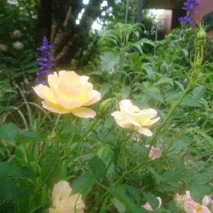 どしゃ降りに…。 耐えて咲いてます。けなげ… (*´∇`*) カリブラコアは4年目の花が咲きました(*´∀`)♪ 夢乙女も 今年は花つきがよく、コラボしてくれてます🌹💠
