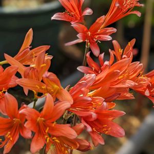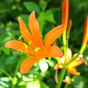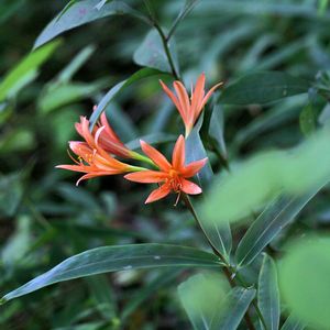 今日のお花 キツネノカミソリ ヒガンバナ科ヒガンバナ属 多年草 本州〜九州に分布 山野に生える。 葉は早春に伸びだし、長さ30〜40cm、幅0.8〜1cmで、夏になると枯れる。 葉が枯れた後、花茎が伸びて高さ30〜50cmになり、橙色の花を散形状に3〜5個付ける。 花被片は斜めに開いて反り返らない。 雄しべは花被片とほぼ同じ長さで、葯は淡黄色。雄しべと雌しべは花の外には突き出ない。 花期8〜9月 花言葉は「妖艶」「悲しい思い出」 8月30日の誕生花である。 ①〜③家の近くの林縁で、今年も咲いてくれました。(8/21撮影) ④上段(2023/8/20撮影) 下段(2024/9/3撮影)