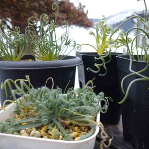 風徐室の植物 左、バビアナ クリスパ💚 4年前にヤフオクで買ってまだ未開花。葉に斑点。病気かな。 右、モラエア プリツェリアナ💚 2年前にエリオクエストさんの楽天市場店で購入。葉が巻き始めました🌀 昨夜は10cm新たに積もり、日中も降り続く予報です⛄