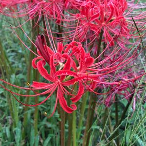 ヒガンバナ^_^ 田の畦道にひと塊りに咲く赤^_^ 黄金色の絨毯と畦の緑がその赤を 引き立ててくれるね^_^ 贅沢な赤^_^