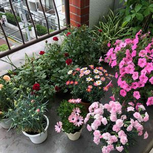 我が家のベランダの右側は お花畑+どんぐり林^_^ ペチュニア満開^_^ ミニバラ🌹可愛く咲いた^_^ カーネーション×3^_^ オステオスペルマム可愛い^_^ オリヅルラン^_^ あっど真ん中の娘、名前忘れた!^_^ ベランダの左側はいちご畑^_^ 真ん中はトマト🍅ナス、ピーマン^_^ 洗濯物は・・・ やばいそろそろクレームが、く〜る〜^_^