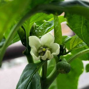 ピーマンの花が咲きました^_^ 白くて小さい花^_^ 可愛い〜^_^ ナスのタグ付けちゃいました^_^ ピーマンですねー^_^ ありがとうございます^_^