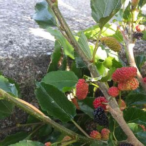 何の実かな。。前から気になっていたので、自力で調べてみた。 おぉ!コレが「桑の実」だったのか~!!! マルベリーとも呼ぶとか。。ベリーというのだから、食べられるのですよね? だけど、黒いのが完熟=食べ頃? どっちかっつうと、赤いほうが美味しそうなのだけれど。。。でも、ちょっと抵抗あるかな(:^ー^A