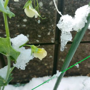 今朝のスナップえんどう💚🤍💚 雪のせいか、氷点下のせいか、葉っぱがシュンとしてますなぁ〜😅