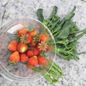 北海道🐎 今日の収穫👨🌾 いちご🍓15個累計70個。 茎ブロッコリー🥦 スナップえんどう。