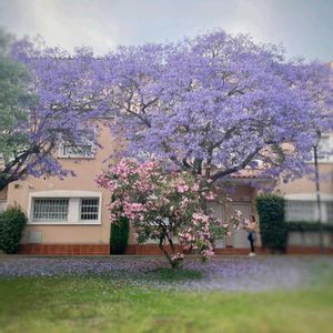 バラとジャカランダの開花 バラはお客さんからガン種で枯れそうだから要らないと引き下げてきた鉢で我が家に来て2年目です✨名前は知らない🌹ルージュピエールかな??? ジャカランダも今年2年目で冬が寒かったのか花が縮こまってしまいました💦4月~5月の間に水切れ起こしたかな?来年は植え替えます😌 屋外で通年管理できないか実験した個体は寒さにやられて開花はしませんでした😅