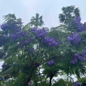 ジャカランダを見に行きました 頭の上にお花が乗ると幸せになるとか(*˘︶˘*).。.:*♡ 乗らなかった(_ - -)_ バタッ グリーンの葉っぱ🌿に上品な紫色💜がとても素敵でした あと、サンゴシトウの赤が、南国を思わせる色で目が覚めました🌴🤭✨
