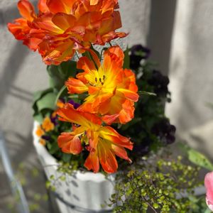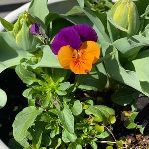 ビオラとチューリップの寄せ植え🌷 おんなじ色味になってしまった😆 チューリップもオレンジ系🧡