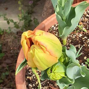 昨日は凄い雨と風でした😖 いただいたモンテオレンジ、一つの球根から蕾が三つある?