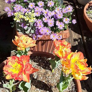 前出の、チューリップ・モンテオレンジ、咲き始めのころはこんなかんじでした。見元パンジーの出目金ダンスと合わせています。ユニークな名前そのもののフリフリパンジーです。上部の斑入りグレコマ・レッドステムは、別の鉢から垂れてきています。斑入り葉と赤い茎が美しい品種ですが、和名「カキドオシ」といわれる通り、なかなか旺盛に繁茂するので、要注意なんですよーヾ(≧∇≦)ノ