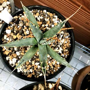 アガベユタエンシスです。 陽当たりが悪くこの時期は100均棚でベランダ組に移動します。 雨続きなので心配です。