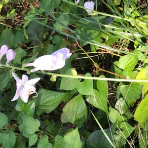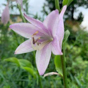 先日まで大きな葉っぱだけでした。花が咲くのかなあと思っていると薄紫のほそい花が咲いていました。
