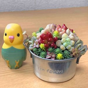 さきほどのpicで、底穴を開けたものがこれです。 メルカリカット苗出身で、だいぶ増えたルビーネックレスと、いろんな寄せ植えに使ってしまってそんなに増えてないグリーンネックレスを植えました。 手持ちのルビネはこの容器に入りきらず、プレステラにも植えています。昨秋にカット苗をプレステラに挿したのですが、かなりガッツリ根付いてましたね… ネックレス系はハンギングが調子がいいと多肉先輩に聞いたので、ハンギングできるようにしました。 どちらもセリアの容器に底穴を開け、カゴもセリアのものです。 植え替えをしてみて、ネックレス系は、四角い鉢には植えづらかったんだなと思いました😅 茎に弾力があるから、すぐに鉢からはみ出てきて、隣の鉢に引っかかって小さい苗が抜けやすかったんですよね。 丸い鉢だと、鉢の縁に沿わせて収めることができるんだなと… まあ、これから鉢に収まらないくらい伸びそうな気がしますが😄