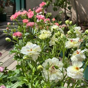 昨日までの暖かい陽気で一気に咲き進みました。ラナンキュラスラックスのピンクのヘラと白のニノス、お花が大きめで6センチくらいあります💕ニノスは白に紅色のラインが入ります。スプレー咲き。 2年目。9号と10号鉢。 去年お迎えした時にはこんなに大きくなるなんて思いもしませんでした😳ヒラヒラピカピカする花びらにぞっこん😍 今朝からは曇りで段々と雨の予報☔ また寒くなりそう🥶💦