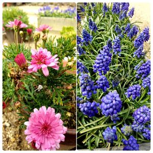 『マーガレット』 あっちこち自由気儘に枝を伸ばして咲き出しました。 綺麗な色の可愛いお花です💗 『ムスカリ』は、窮屈そう、木箱の中で押しくらまんじゅう😅