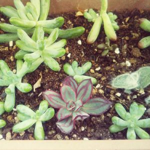 久しぶりの投稿です! 多肉の季節ですね…皆様いかがお過ごしですか?? わたしは今年本格的に花粉症デビューしまして鼻水とクシャミと戦ってます(´இωஇ`) いくつかの鉢の植え替えを兼ねて、子どもの生まれた友達夫婦にプレゼントということで寄せ植え作ってみました。 初めて作りましたが難しい…