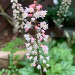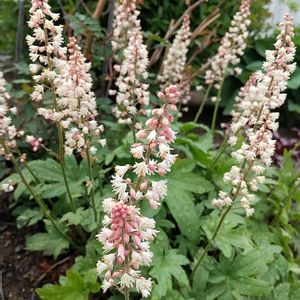 ⬅️✨✨ヒューケレラ ✨✨ フレッシュグリーン ↗️✨ティアレラ スプリングシンフォニー ↘️✨ティアレラ シルベラード まだ咲き続けています💕 「ヒューケレラ」は交配された「ヒューケラ」と「ティアレラ」からきています❣️ 葉っぱはヒューケラ、花はティアレラの様です🤗 🌿ヒューケレラ(フレッシュグリーン)は、葉のふち部分の切れ込みが深いためシャープでカッコイイ✨シルバーっぽくて草姿はロゼット状です。 🌸花は穂状に集まり円筒型の外観となります。花(花冠)は鐘形、花は桃色から白色で、茎はしっかりしています。 ティアレラのお花を一回り大きくした感じです。 梅雨空ですが、ティアレラの可憐なお花がシェードガーデンを明るくしてくれてます🥰