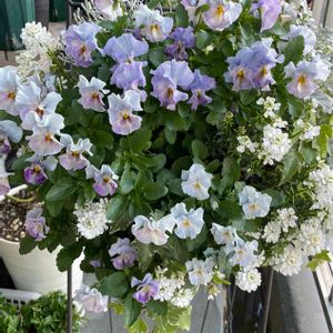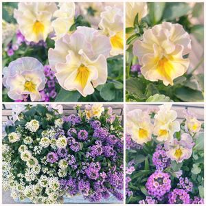 花日和オリジナルビオラ イリスプリエール•*¨*•.¸¸♬︎ アリッサムとシエルブリエさんと 寄せてます☺️ 相変わらずアリッサムの勢いが すごくてෆ̈ 鉢から溢れすぎてます😂 前picの子とは違った雰囲気✧︎*。 イリスプリエールさんの花色が とっても素敵です☺️