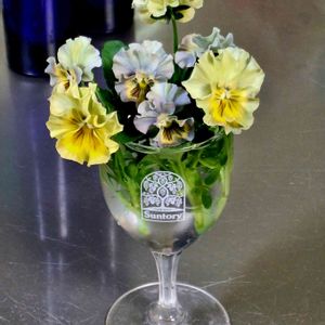 諸事情によりカットしたシエルブリエを、花器化しているワイングラスに挿してみました。✨ キッチンに飾って楽しんでいます。🤗🎶