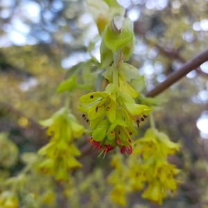 トサミズキ 赤い蕊がくっきりと 茶色く小さくなってるのは、花粉を出し切ったあと?