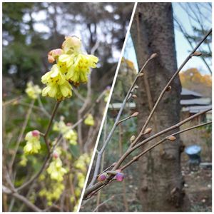 2月に「赤くて可愛いつぼみ(写真右)なんの花だろう?」と思ってましたが、3月に花が咲いたところを見るに、ヒュウガミズキのようです。 ※でも…トサミズキとの区別の仕方はよく分からず💦 赤い部分を未だ帽子のように頭に載せている姿も可愛い☺ 2021.3.7@庭園美術館