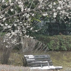 🏷️火曜ベンチに参加します。 公園のベンチに昨日の雪が残ってました。 3枚目と5枚目には、梅と一緒にロウバイも咲いています。🩷💛