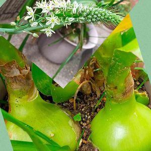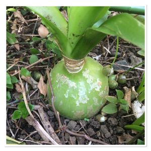 実家から持って帰ってきた子株。 誰も名前も知らず、玄関で放置されてた。 親株は枯れ気味。球根のような子ども二個を植えたら元気に。 なんだこれ?