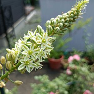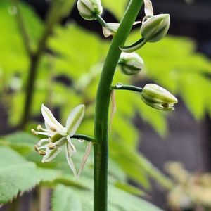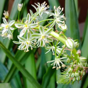 【オーニソガラムコーダツム】 《キジカクシ科》 花言葉 『純粋』『無垢』『才能』『純白』 『清らかさ』 別名 海葱(カイソウ) 子持ち欄(コモチラン) シーオニオン 茎先に総状花序を出し 白い花びらに 緑色の筋の入った花を たくさん咲かせます。 我が家に来て 3年目漸く開花 子株もポコポコ 沢山出来ました💓。