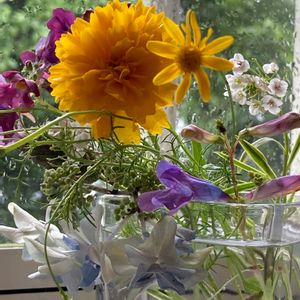 こちらも庭花の簡単アレンジ 雨に打たれた花が痛ましくて 2時間もカッパでウロウロ ☔️に濡れながらのスマホ撮影はジャック差し込むバッテリーチャージがしばらく出来なくなるのでご注意下さいね❣️