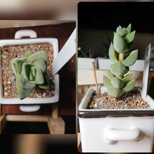 ←真上から見た図 かっけぇ! |´∀`) →横から見ると ( ・᷄ὢ・᷅ ) 嫁さんが「この子ぷくぷくして可愛い、職場に持っていく!」 …3ヶ月後、見事に徒長 (ノД`ll) 聞けばろくに陽も差さない薄暗い仕事場で言いつけ通りにひたすら毎週水やりしたらこうなったと… はぁ、切り戻さなきゃ (ノД`)シクシク