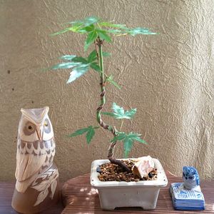 🏷️フクロウ祭 🏷️幸せを呼ぶフクロウ祭り 参加させて頂きます 😊❣️ ①② 実生のモミジです。 上がビヨ~ンと伸びていたのをパッツン✂️したらちょっと格好良くなったような気がします。 切った枝は挿し木にしましたよ~🤭🎶 ③サツキ これは挿し木したものです。 写真に撮ってみるとごちゃごちゃですね 😂💦 ④ナンキンハゼ これは実生のもの。 ずいぶん間延びしちゃったな~🤣💦 フクロウさんが小さく見えま~す!🦉