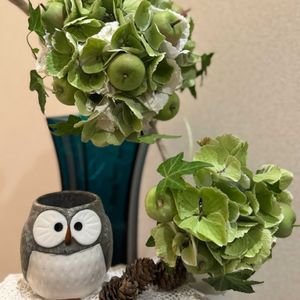 🏷️フクロウ祭 No.1 遅刻ですが、参加しまーす✨🦉 宜しくお願いします✨💚 長崎からお連れしたフクロウ🦉ちゃんと✨ 緑色と白色のアジサイのお花と💚🤍💚ブーケの一部です💐 青りんごも入っています✨🍏💚🍏( ◠‿◠ ) No.2 3連のブーケ💐です。 真ん中の下に持ち手があります✨💚🤍💚( ◠‿◠ ) 娘作ーブーケ No.3、4 ブーケで余ったお花を花瓶に✨💚🤍💚 大きなアジサイ、そして葉っぱ🌿 スモークツリーも可愛い✨ 奥に見えるのはカモミールではないそうです🤍🌿 No.5 真っ白な八重のクチナシのお花🤍公園に咲いています🤍🤍🌿 🏷️フクロウ祭 🏷️純白マニア 🏷️紫陽花アジサイあじさい アジサイ備忘録として〜No.6