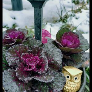 昨夜から降り続いた雪が積もりました☃️雪が降ると寒〜い🥶 ①今年、お迎えした葉牡丹、光子「ブラックパール」です、光沢のある黒から、グラデーションのようにつながる紫色の葉が素敵😃 母と頑固ジィの会話 「今年の森光子さんは黒やって」 「黒い着物を着た森光子さん、綺麗やったな〜」 え〜なんの話?🤣 縁起物の金のフクロウで🏷️フクロウ祭りに参加します 富山県中央植物園(1月21日)より ②スノードロップが咲いたとの情報があり見てきました、下向きに咲く真っ白な小さなお花がかわいい…春を告げるお花らしいけど…早い開花に驚きです😃 ③マッソニア・ロンギペス…南アフリカの球根植物。(日本では)10月以降に白い糸状の花を、2枚の葉の付け根からいきなり咲かせる。面白い姿で人気があるそう (高山植物室にて) ④ナルキッスス・カンダプリクス・フォリオスス…モロッコ産・スイセンの仲間でラッパのような形のお花が可愛い (高山植物室にて) ⑤ヌマスギの呼吸根達…いつ見ても可愛い😊