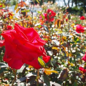 京成バラ園に行ってきました。 この"紅"は、カタログ落ちしている京成バラ園芸の品種のようですが、花つきも良くて、秋空にとても合っていました。