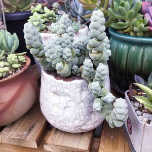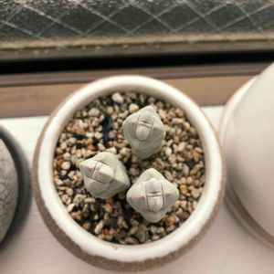 これも、多肉屋さんで一目惚れ💕で購入💸 なんか変なのばかりに👀目が行く 🍂玉稚児(たまちご) クラッスラ属 YouTubeで誰かが、目玉👀つけてたねw 真っ白のパズルの葉がかわいい💕 横になってたら、幼虫にしか見えない💦 クラッスラ属らしい葉の重なり。 面白すぎるんだけど😁 徒長すると、中の茎だけが伸びてろくろっ首になるみたい。 見たいかも?笑