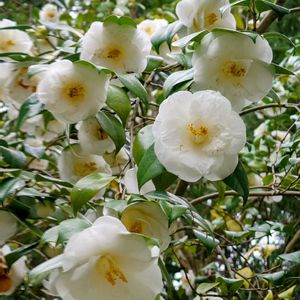 これは、卜半椿(ボクハンツバキ)でしょうか 数本のしべの先が白い花が咲いたような形になっていて、黄色のしべの中に映えていました 初めて見る椿に嬉しくなりました