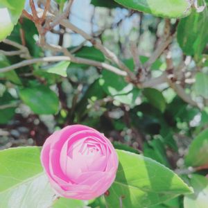 昨日の午前、市内を散歩途中に見かけたピンク色の椿。