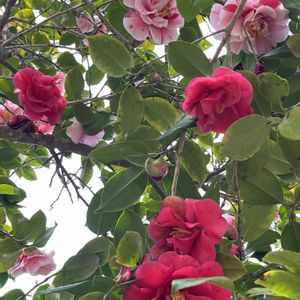実家の椿です 母が椿が大好きでいろいろ植えています 木の下に入れるので下から見上げて撮りました 2メートル以上はあります😄