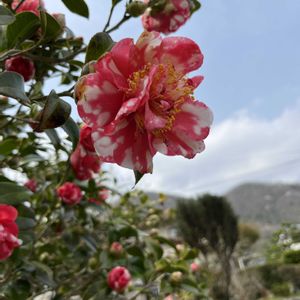 椿 月の輪です 白と赤の絞りですが、赤の花も多く咲いています 2枚目が同じ木の赤の花です