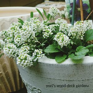 スイートアリッサム&ビオラ この鉢はクレマチスビオラの鉢なのでそろそろ引っ越しさせないとデス😅 アリッサムの根は厄介なので心配💦