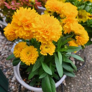 ᰔᩚ ᥫᩣ コレオプシスソランナ ゴールデンスフィア 二番花が綺麗に咲いてきました💛 マリーゴールド 3色の元気花💛🧡♥️ ペチュニア ライムグリーンが爽やか〰️💚💛