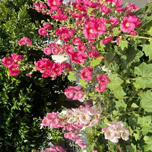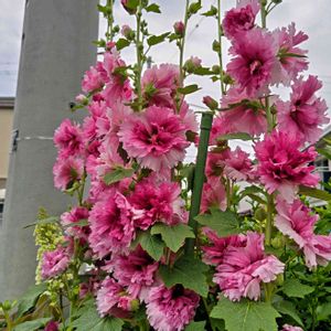 昨年蒔いたタチアオイが、2m以上に伸び咲き始めました。‼️昨年は咲かなかったので、これから咲く株は、どんな色合いか楽しみですね🤗
