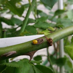 夕方、ふと薔薇🌹の見回りしていたら、目👀に止まった黄色い何か💦 わたくし視力が悪く(でも裸眼ですが😅)近寄ってみたら黒い丸が2つ🎵 あらっ可愛いわ😍と携帯でΣp📷ω・´) てんとう虫に似てますが🤔 初めてお目にかかりました🤗 「キイロテントウ」と判明しました😀