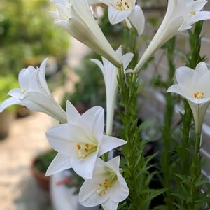 昨年、3㍍以上に伸びた我が家の💚シンテッポウユリ 優雅🤍✨ 今年は、1.5㍍位で咲きました🤗この位の背丈がちょうど見やすいですね💖