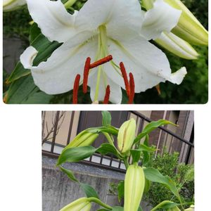 オリエンタル百合⚜️ シャルドネ✨️ ワインの🍷名前のようなこのお花ෆ.*・゚ 去年の11月に球根を植えてから、咲くのをずっと楽しみにしてました✨️ 八重咲き、純白で大きな百合がやっと咲きました♪ 関東は今日も熱中症警戒アラートが発表されました。 朝からすごい暑さです🥵