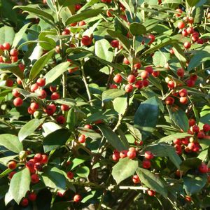 アメリカヒイラギとシナヒイラギ。 赤い実がいっぱいなっていました。 アメリカヒイラギはすごく背が高い木で、シナヒイラギは赤い実がとても沢山なっています。葉の形もやや違いますね。 ヒイラギも色々な種類がありそうです。